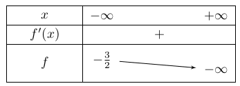 De plus, $f(t)=-\mathrm{e}^t-\dfrac{3}{2}$, donc $\displaystyle\lim_{t\to +\infty} f(t)=-\infty$. Finalement :