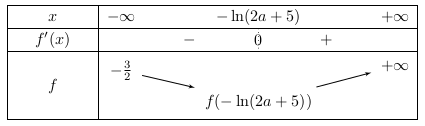 f'(t)\geq 0 \iff \mathrm{e}^{t}\geq \dfrac{1}{2a+5} \iff t\geq \ln\left(\dfrac{1}{2a+5}\right)\iff t\geq -\ln(2a+5)